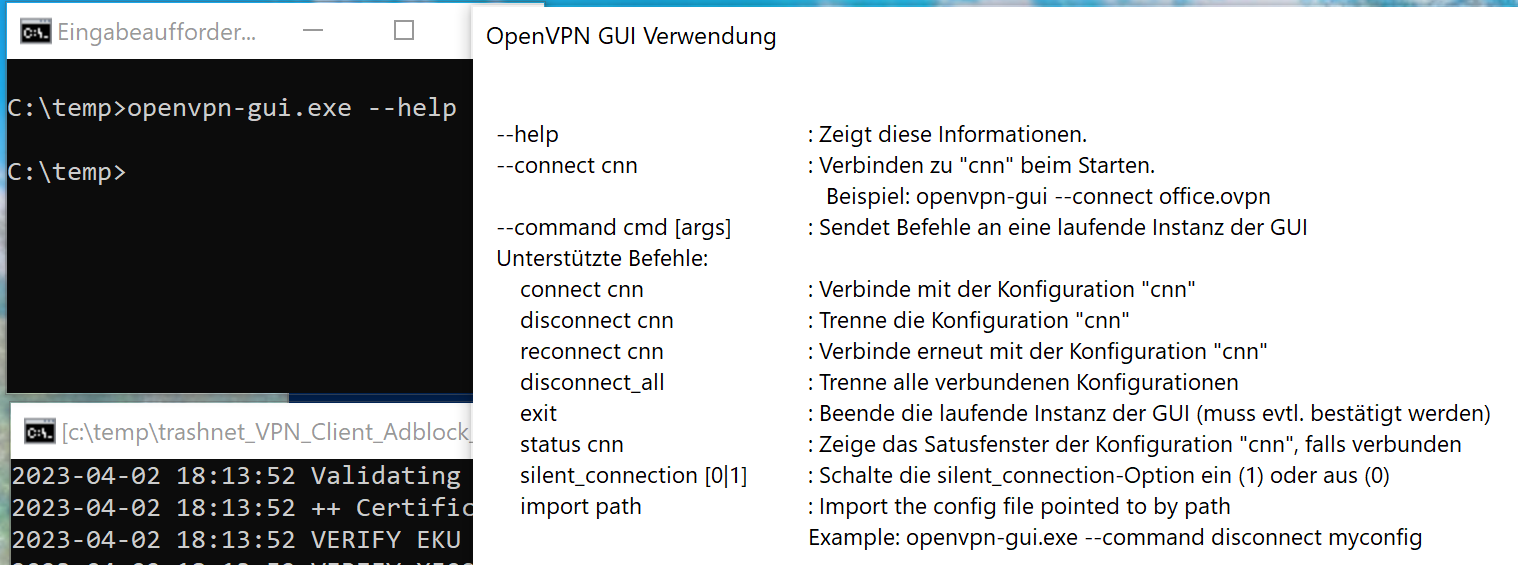 NatĂĽrlich hat hier Befehl openvpn-gui.exe --command disconnect config.ovpn keinen Effekt. Wie die Hilfe klar aussagt, beziehen sich diese Befehle nur auf eine laufende “openvpn-gui.exe” Instanz. Die Verbindung wird auch nicht ĂĽber das Argument “–config” aufgebaut. Hier heisst dieses Argument “–connect”.